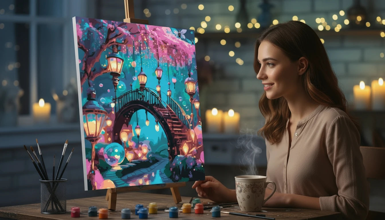 “Enchanted Street” is for everyone who loves the mood of magical stories, urban fantasy, vibrant decor, and unique interior accents. Perfect for teens, creative adults, or couples for a cozy night of painting together.