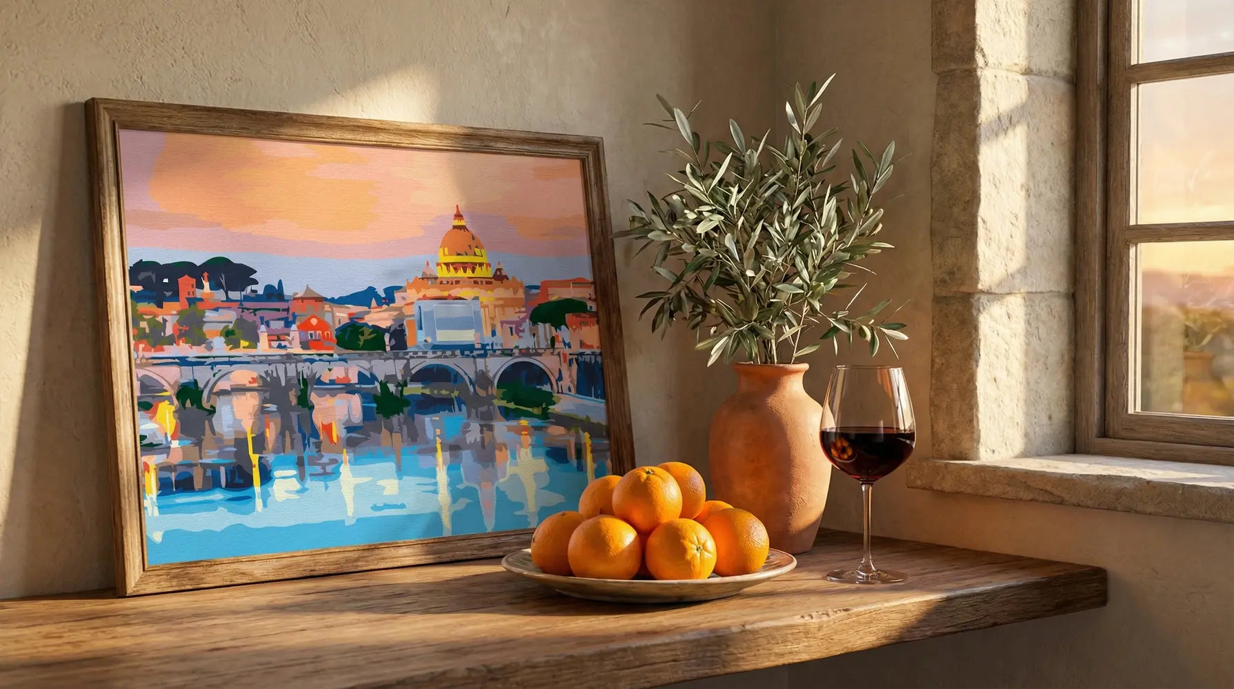 Majesteetlik vaade Roomale avaneb, kus ikooniline Ponte Sant'Angelo sild ulatub üle Tiberi jõe, juhtides pilku Püha Peetruse basiilika suurejoonelise kupli poole. Päikeseloojangu soojad toonid värvivad taevast ja heidavad veele virvendavaid peegeldusi, luues rahuliku ilu ja ajatu elegantsi stseeni.