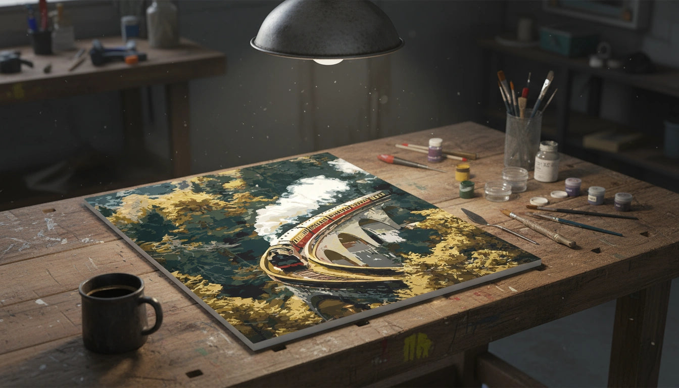 Everything you need in one box: stretched canvas, acrylic paints, 3 brushes, varnish, instructions and a video guide via QR code, mounting hardware.
