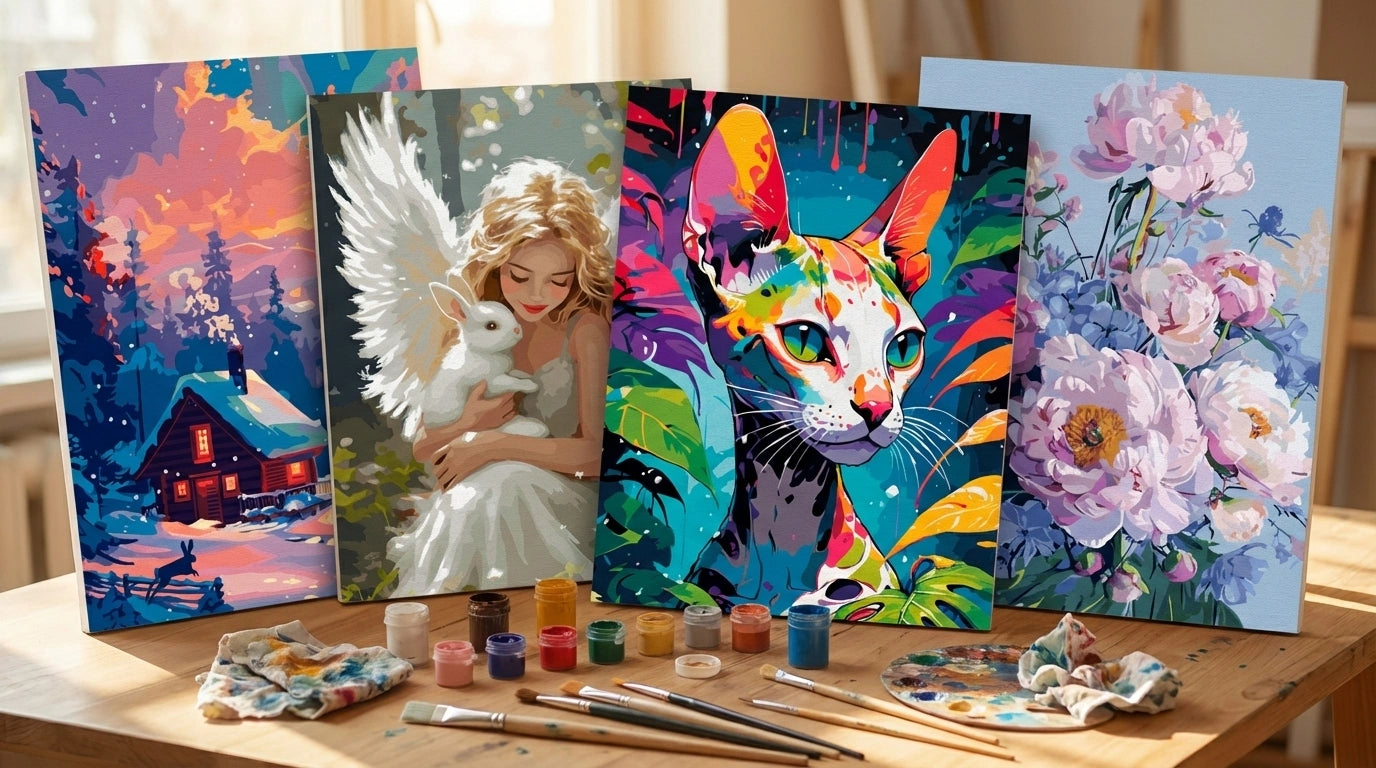 Wszystko, czego potrzebujesz, w jednym pudełku: płótno, farby akrylowe, 3 pędzle, lakier, instrukcja i przewodnik wideo dostępny poprzez kod QR, elementy montażowe.