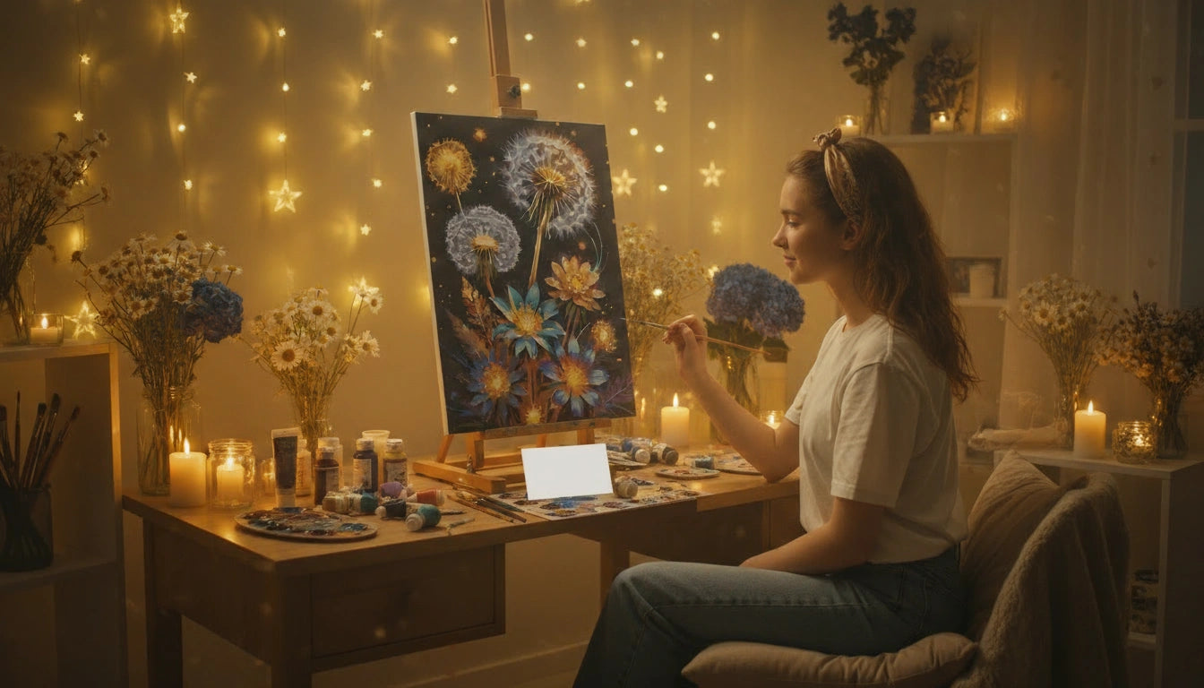 On the canvas: dreamlike dandelions and flowers that resemble glowing constellations against a night sky. Bright yellow and blue accents stand out on the dark background, filling the painting with a sense of lightness, dreams, and the quiet, magical beauty of nature.