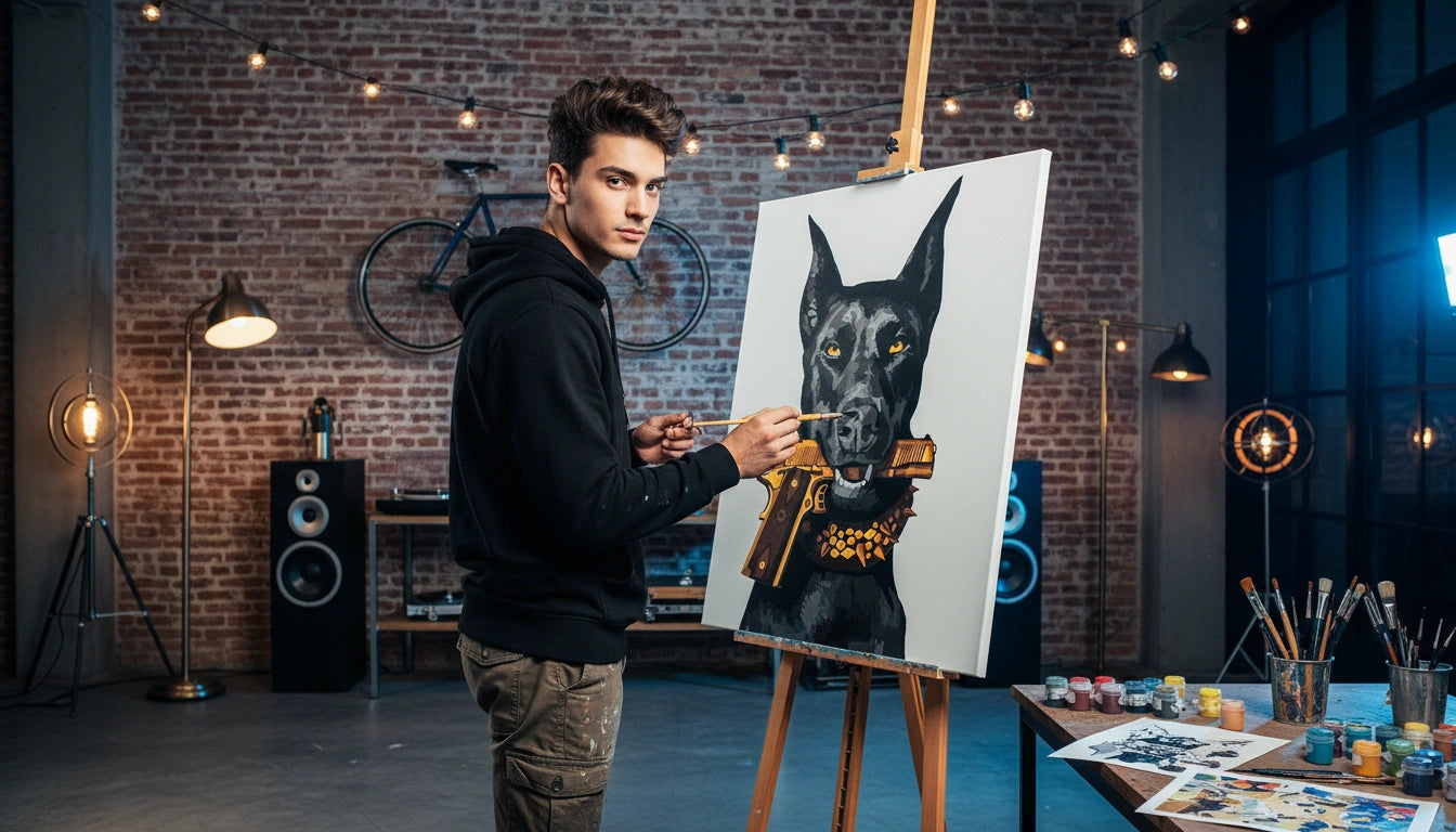This artwork is for fans of modern culture, urban, masculine, or loft interiors, hi-tech enthusiasts, dog lovers, and anyone who appreciates art with attitude. An excellent choice for teens, young adults, the confident and independent.