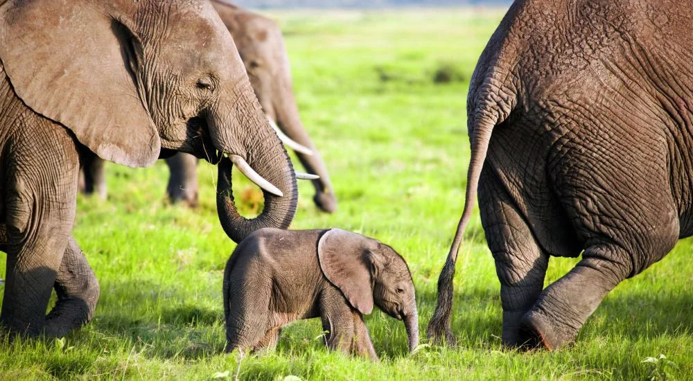 В коллекции представлены сюжеты с африканскими пейзажами, семьями слонов и их силуэтами на фоне заката.
